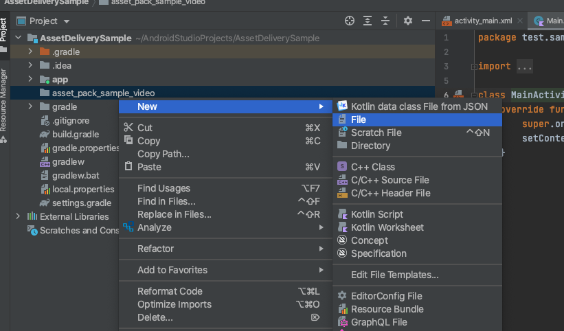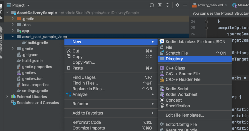 4. (예제의 경우) asset_pack_sample_video 에 실제 Asset에 담길 자식 디렉토리 생성 (src/main/asset)