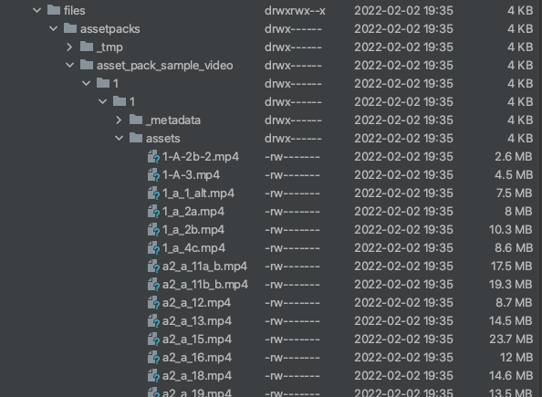 View -> Tool Windows -> Device File Exploer 로 접근하여 data->data->해당프로젝트 패키지명으로 접근하면 아래 스크린샷처럼 assets 폴더에 영상이 다운로드 된것을 볼 수 있다.