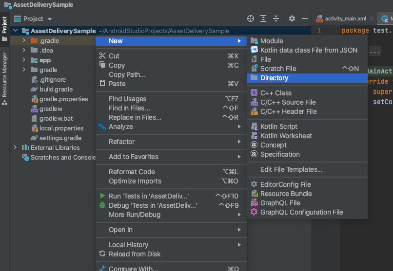 AssetDeliverySample 에서 디렉토리를 생성한다. 디렉토리명은 소문자와 밑줄만 포함하여 아무렇게나 작성하면 된다.